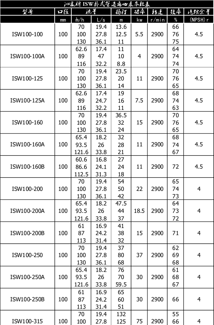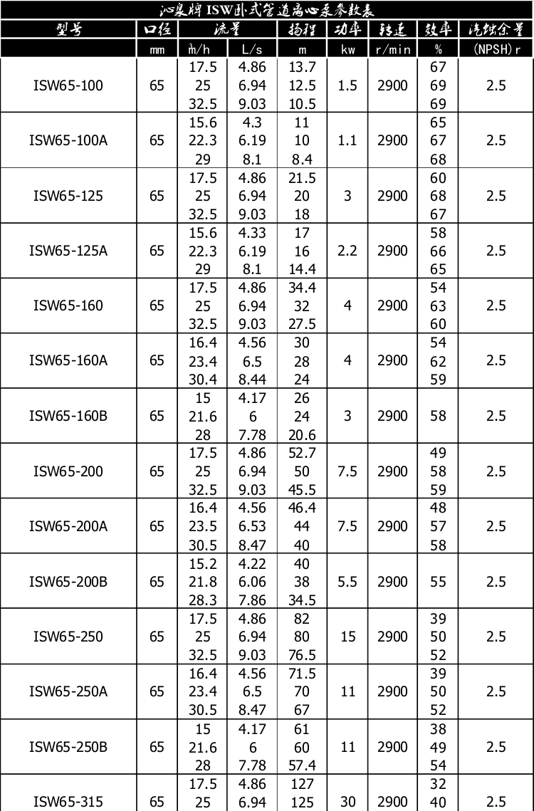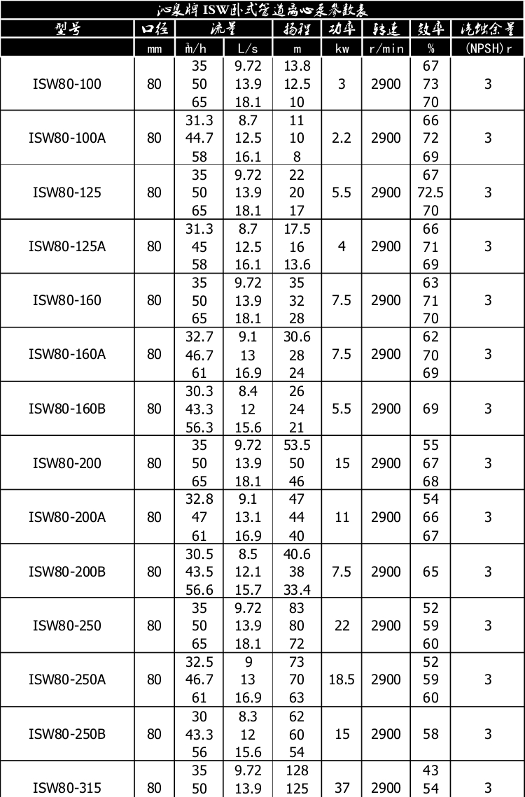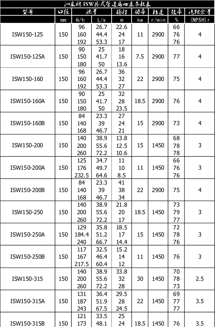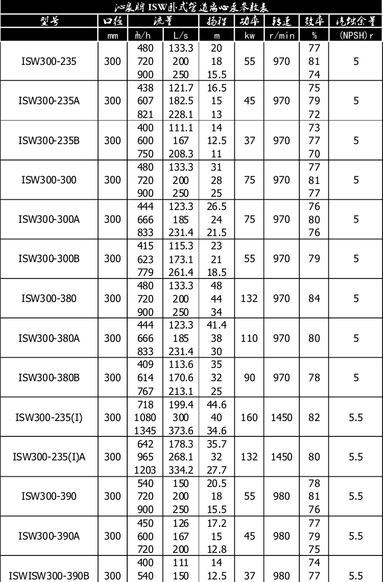 一、產(chǎn)品概述: ISW臥式管道離心泵為單級(jí)單吸臥式離心泵,該泵由電機(jī)、泵和底座三部分組成。泵結(jié)構(gòu)包括泵體、葉輪、泵蓋、機(jī)械密封等零部件組成。泵體和泵蓋的部分是從葉輪北面出剖分的,即為后開門結(jié)構(gòu)形式。泵和電機(jī)同軸,為了平衡泵的軸向力,大多數(shù)泵的葉輪前、后均設(shè)有密封環(huán),并在葉輪后蓋板上設(shè)有平衡孔,其中殘余軸向力由電機(jī)內(nèi)軸承受。泵與電機(jī)直接,安裝時(shí)無(wú)需校正,具有共同底座,采用JGD型減震器進(jìn)行隔振。 二、主要用途: 1、ISW臥式清水泵,供輸送清水及物理化學(xué)性質(zhì)類似于清水的其他液體之用,適用于工業(yè)和城市給排水,高層建筑增壓送水,園林噴灌,消防增壓,遠(yuǎn)距離輸送,暖通制冷循環(huán)、浴室等冷暖水循環(huán)增壓及設(shè)備配套,使用溫度T≤80℃。 2、ISWR臥式熱水泵廣泛適用于:冶金、化工、紡織、造紙、以及賓館飯店等鍋爐熱水增壓循環(huán)輸送及城市采暖系統(tǒng),ISWR型使用溫度T≤120℃。 3、lSWH臥式化工泵,供輸送不含固體顆料,具有腐蝕性,粘度類似于水的液體,適用于石油、化工、冶金、電力、造紙、食品制藥和合成纖維等部門,使用溫度為-20~C~+120℃。 4、lSWB臥式管道油泵,供輸送汽油、煤油、柴油等用油類產(chǎn)品或易燃、易爆液體,被輸送介質(zhì)溫度為一20~C~+120℃。 三、工作條件: 1、吸入壓力≤1.6MPa,或泵系統(tǒng)最高工作壓力 ≤1.6MPa,即泵吸入口壓力+泵揚(yáng)程≤1.6MPa、泵靜壓試驗(yàn)壓力為2.5MPa,訂貨時(shí)請(qǐng)注明系統(tǒng)工作壓力。泵系統(tǒng)工作壓力大于1.6MPa時(shí)應(yīng) 在訂貨時(shí)另行提出,以便在制造時(shí)泵的過流部分和聯(lián)接部分采用鑄鋼材料。 2、環(huán)境溫度<40℃,相對(duì)濕度<95%。 3、所輸送介質(zhì)中固體顆粒體積含量不超過單位體積的0.1%,粒度<0.2mm。 注:如使用介質(zhì)為帶有細(xì)小顆粒,請(qǐng)?jiān)谟嗀洉r(shí)注明,以便廠家采用耐磨式機(jī)械密封。 四、產(chǎn)品特點(diǎn): 運(yùn)行平穩(wěn):泵軸的絕對(duì)同心度及葉輪優(yōu)異的動(dòng)靜平衡,保證平穩(wěn)運(yùn)行,絕無(wú)振動(dòng)。 滴水不漏:不同材質(zhì)的硬質(zhì)合金密封,保證了不同介質(zhì)輸送均無(wú)泄漏。 噪音低:兩個(gè)低噪音軸承支撐下的水泵,運(yùn)轉(zhuǎn)平穩(wěn),除電機(jī)微弱聲響,基本無(wú)噪音。 故障率低:結(jié)構(gòu)簡(jiǎn)單合理,關(guān)鍵部分采用國(guó)際一流品質(zhì);配套,整機(jī)無(wú)故障工作時(shí)間大大提高。 維修方便:更換密封、軸承,簡(jiǎn)易方便。 占地更省:出口可向左、向右、向上三個(gè)方向,便于管道布置安裝,節(jié)省空間。 五、起動(dòng)與停車: ISW臥式管道離心泵起動(dòng)前準(zhǔn)備: 1、試驗(yàn)電機(jī)轉(zhuǎn)向是否正確,從電機(jī)頂部往泵看為順時(shí)針旋轉(zhuǎn),試驗(yàn)時(shí)間要短,以免使機(jī)械密封干磨損。 2、打幵排氣^使液體充滿整個(gè)泵體,待滿后關(guān)閉排氣閥。 3、檢查各部位是否正常。 4、用手盤動(dòng)泵以使?jié)櫥哼J入機(jī)械密封端面。 5、高溫型應(yīng)先逬行預(yù)熱,升溫速度50℃/小時(shí),以保證各部受熱均勻。 起動(dòng): 1、全開進(jìn)口閥門。2、關(guān)閉吐出管路閥門。3、起動(dòng)電機(jī),觀察泵運(yùn)行是否正桷。4、調(diào)節(jié)出口閥幵度以所需工況,如用戶在泵出口處裝有流靈表或壓力表,應(yīng)通過調(diào)節(jié)出口閥門幵度使泵在性能參數(shù)表所列的頷定點(diǎn)上運(yùn)轉(zhuǎn),如用戶在泵出口處裝有流量表或壓力表,應(yīng)通過調(diào)節(jié)出口闔門幵度,測(cè)璗泵的電機(jī)電流,使電機(jī)在額定電流內(nèi)運(yùn)行,否則將造成泵超員荷運(yùn)行(即大電流運(yùn)行)至使電機(jī)燒壞。調(diào)正好的出口閥門幵啟大與小和管道工況有關(guān)。5、檢査軸封泄漏情況,正常時(shí)機(jī)械密封泄漏應(yīng)小于3滴/分。6、檢查電機(jī)、軸承處溫升≦70℃。 停車: 1、高溫型先降溫,降溫速度<10℃/分,把溫度降低到80℃以下,才能停車。2、關(guān)閉吐出管路閥門。3、停止電機(jī)。4、關(guān)閉進(jìn)口閥門。5、如長(zhǎng)期停車,應(yīng)將泵內(nèi)液體放盡。 六、產(chǎn)品維護(hù): 1、運(yùn)行中的維護(hù): (1)進(jìn)口管道必須充滿液體,禁止泵在汽蝕狀態(tài)下長(zhǎng)期運(yùn)行。(2)定時(shí)檢查電機(jī)電流値,不得超過電機(jī)頷定電流。(3)泵進(jìn)行長(zhǎng)期運(yùn)行后,由于機(jī)械磨損,使機(jī)組噪音及振動(dòng)增大時(shí),應(yīng)停車檢查,必要時(shí)可更換易損零件及軸承,機(jī)組大修期一般為一年。 2、機(jī)械密封維護(hù): (1)機(jī)械密封潤(rùn)滑應(yīng)清潔無(wú)固體顆粒。(2)嚴(yán)禁機(jī)械密封在干磨情況下工作。(3)起動(dòng)前應(yīng)先盤動(dòng)泵(電機(jī))幾圈,以免突然起動(dòng)造成石墨環(huán)斷裂損壞。(4)密封泄漏量允差3滴/分。否則應(yīng)檢查。