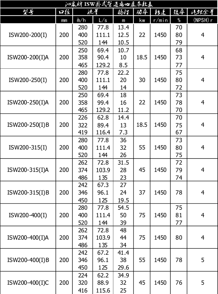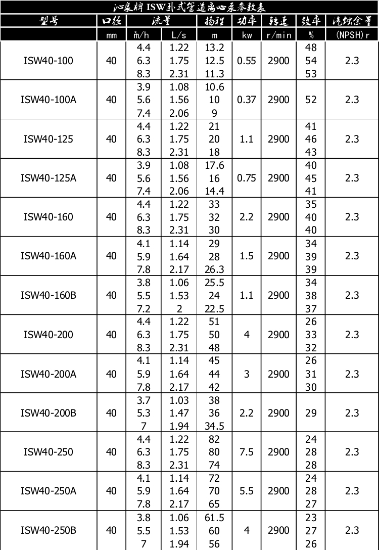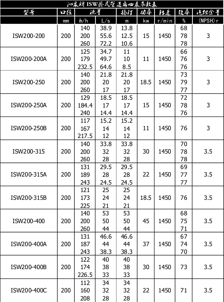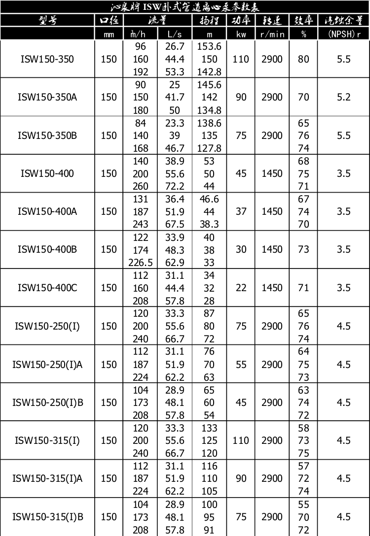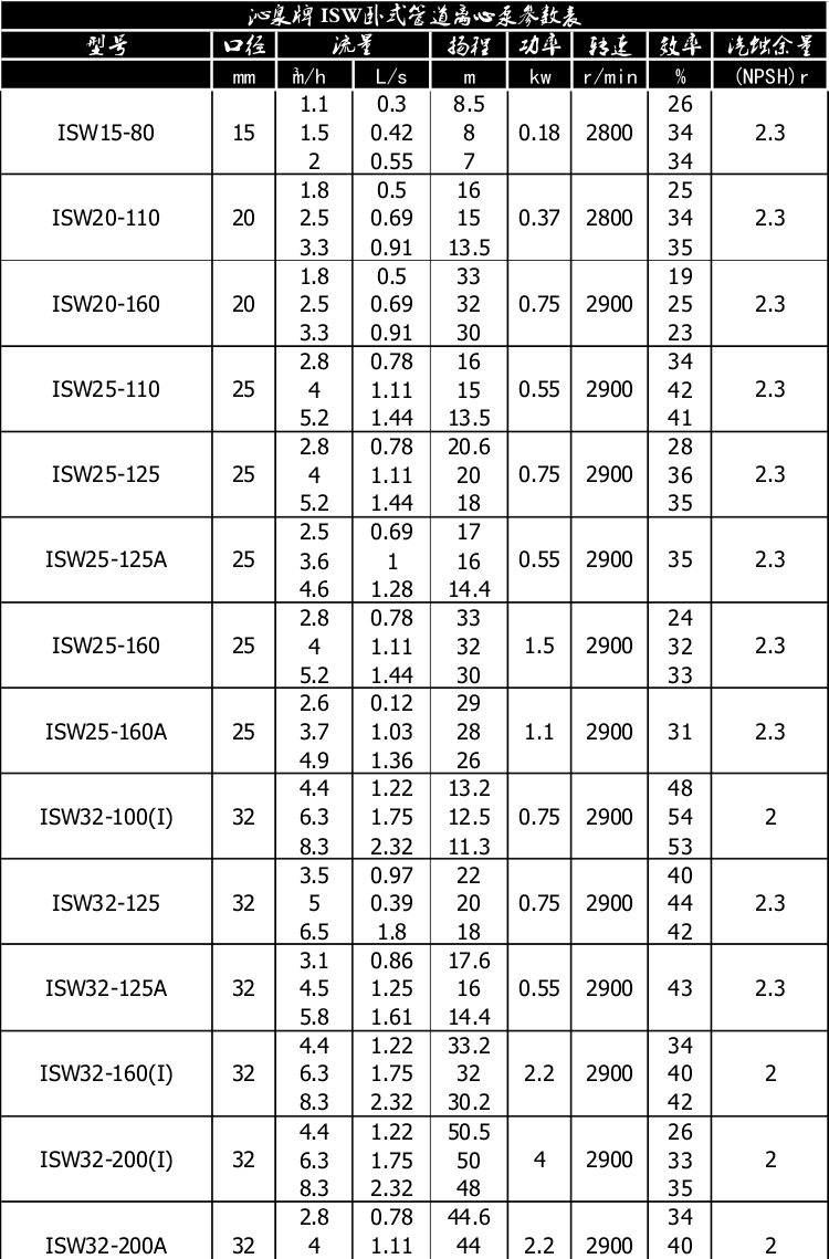 一、產(chǎn)品概述: ISW臥式管道離心泵為單級(jí)單吸臥式離心泵,該泵由電機(jī)、泵和底座三部分組成。泵結(jié)構(gòu)包括泵體、葉輪、泵蓋、機(jī)械密封等零部件組成。泵體和泵蓋的部分是從葉輪北面出剖分的,即為后開門結(jié)構(gòu)形式。泵和電機(jī)同軸,為了平衡泵的軸向力,大多數(shù)泵的葉輪前、后均設(shè)有密封環(huán),并在葉輪后蓋板上設(shè)有平衡孔,其中殘余軸向力由電機(jī)內(nèi)軸承受。泵與電機(jī)直接,安裝時(shí)無(wú)需校正,具有共同底座,采用JGD型減震器進(jìn)行隔振。 二、主要用途: 1、ISW臥式清水泵,供輸送清水及物理化學(xué)性質(zhì)類似于清水的其他液體之用,適用于工業(yè)和城市給排水,高層建筑增壓送水,園林噴灌,消防增壓,遠(yuǎn)距離輸送,暖通制冷循環(huán)、浴室等冷暖水循環(huán)增壓及設(shè)備配套,使用溫度T≤80℃。 2、ISWR臥式熱水泵廣泛適用于:冶金、化工、紡織、造紙、以及賓館飯店等鍋爐熱水增壓循環(huán)輸送及城市采暖系統(tǒng),ISWR型使用溫度T≤120℃。 3、lSWH臥式化工泵,供輸送不含固體顆料,具有腐蝕性,粘度類似于水的液體,適用于石油、化工、冶金、電力、造紙、食品制藥和合成纖維等部門,使用溫度為-20~C~+120℃。 4、lSWB臥式管道油泵,供輸送汽油、煤油、柴油等用油類產(chǎn)品或易燃、易爆液體,被輸送介質(zhì)溫度為一20~C~+120℃。 三、工作條件: 1、吸入壓力≤1.6MPa,或泵系統(tǒng)最高工作壓力 ≤1.6MPa,即泵吸入口壓力+泵揚(yáng)程≤1.6MPa、泵靜壓試驗(yàn)壓力為2.5MPa,訂貨時(shí)請(qǐng)注明系統(tǒng)工作壓力。泵系統(tǒng)工作壓力大于1.6MPa時(shí)應(yīng) 在訂貨時(shí)另行提出,以便在制造時(shí)泵的過流部分和聯(lián)接部分采用鑄鋼材料。 2、環(huán)境溫度<40℃,相對(duì)濕度<95%。 3、所輸送介質(zhì)中固體顆粒體積含量不超過單位體積的0.1%,粒度<0.2mm。 注:如使用介質(zhì)為帶有細(xì)小顆粒,請(qǐng)?jiān)谟嗀洉r(shí)注明,以便廠家采用耐磨式機(jī)械密封。 四、產(chǎn)品特點(diǎn): 運(yùn)行平穩(wěn):泵軸的絕對(duì)同心度及葉輪優(yōu)異的動(dòng)靜平衡,保證平穩(wěn)運(yùn)行,絕無(wú)振動(dòng)。 滴水不漏:不同材質(zhì)的硬質(zhì)合金密封,保證了不同介質(zhì)輸送均無(wú)泄漏。 噪音低:兩個(gè)低噪音軸承支撐下的水泵,運(yùn)轉(zhuǎn)平穩(wěn),除電機(jī)微弱聲響,基本無(wú)噪音。 故障率低:結(jié)構(gòu)簡(jiǎn)單合理,關(guān)鍵部分采用國(guó)際一流品質(zhì);配套,整機(jī)無(wú)故障工作時(shí)間大大提高。 維修方便:更換密封、軸承,簡(jiǎn)易方便。 占地更省:出口可向左、向右、向上三個(gè)方向,便于管道布置安裝,節(jié)省空間。 五、起動(dòng)與停車: ISW臥式管道離心泵起動(dòng)前準(zhǔn)備: 1、試驗(yàn)電機(jī)轉(zhuǎn)向是否正確,從電機(jī)頂部往泵看為順時(shí)針旋轉(zhuǎn),試驗(yàn)時(shí)間要短,以免使機(jī)械密封干磨損。 2、打幵排氣^使液體充滿整個(gè)泵體,待滿后關(guān)閉排氣閥。 3、檢查各部位是否正常。 4、用手盤動(dòng)泵以使?jié)櫥哼J入機(jī)械密封端面。 5、高溫型應(yīng)先逬行預(yù)熱,升溫速度50℃/小時(shí),以保證各部受熱均勻。 起動(dòng): 1、全開進(jìn)口閥門。2、關(guān)閉吐出管路閥門。3、起動(dòng)電機(jī),觀察泵運(yùn)行是否正桷。4、調(diào)節(jié)出口閥幵度以所需工況,如用戶在泵出口處裝有流靈表或壓力表,應(yīng)通過調(diào)節(jié)出口閥門幵度使泵在性能參數(shù)表所列的頷定點(diǎn)上運(yùn)轉(zhuǎn),如用戶在泵出口處裝有流量表或壓力表,應(yīng)通過調(diào)節(jié)出口闔門幵度,測(cè)璗泵的電機(jī)電流,使電機(jī)在額定電流內(nèi)運(yùn)行,否則將造成泵超員荷運(yùn)行(即大電流運(yùn)行)至使電機(jī)燒壞。調(diào)正好的出口閥門幵啟大與小和管道工況有關(guān)。5、檢査軸封泄漏情況,正常時(shí)機(jī)械密封泄漏應(yīng)小于3滴/分。6、檢查電機(jī)、軸承處溫升≦70℃。 停車: 1、高溫型先降溫,降溫速度<10℃/分,把溫度降低到80℃以下,才能停車。2、關(guān)閉吐出管路閥門。3、停止電機(jī)。4、關(guān)閉進(jìn)口閥門。5、如長(zhǎng)期停車,應(yīng)將泵內(nèi)液體放盡。 六、產(chǎn)品維護(hù): 1、運(yùn)行中的維護(hù): (1)進(jìn)口管道必須充滿液體,禁止泵在汽蝕狀態(tài)下長(zhǎng)期運(yùn)行。(2)定時(shí)檢查電機(jī)電流値,不得超過電機(jī)頷定電流。(3)泵進(jìn)行長(zhǎng)期運(yùn)行后,由于機(jī)械磨損,使機(jī)組噪音及振動(dòng)增大時(shí),應(yīng)停車檢查,必要時(shí)可更換易損零件及軸承,機(jī)組大修期一般為一年。 2、機(jī)械密封維護(hù): (1)機(jī)械密封潤(rùn)滑應(yīng)清潔無(wú)固體顆粒。(2)嚴(yán)禁機(jī)械密封在干磨情況下工作。(3)起動(dòng)前應(yīng)先盤動(dòng)泵(電機(jī))幾圈,以免突然起動(dòng)造成石墨環(huán)斷裂損壞。(4)密封泄漏量允差3滴/分。否則應(yīng)檢查。